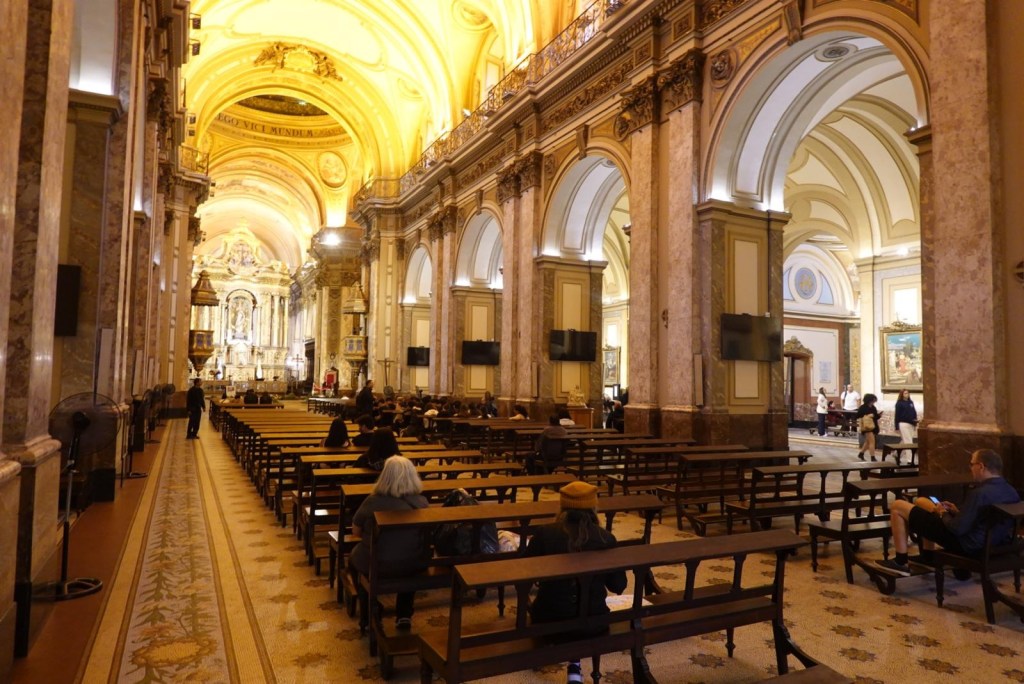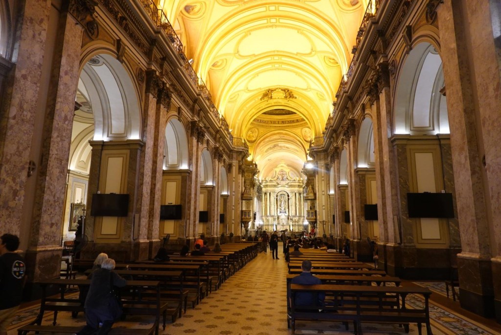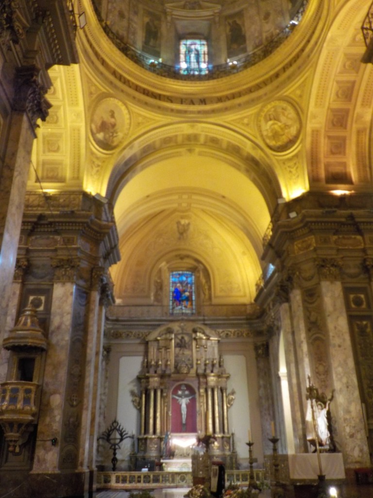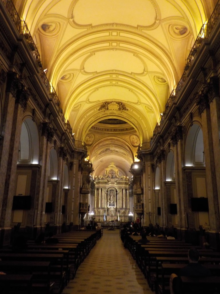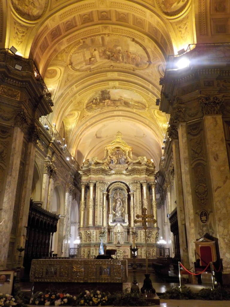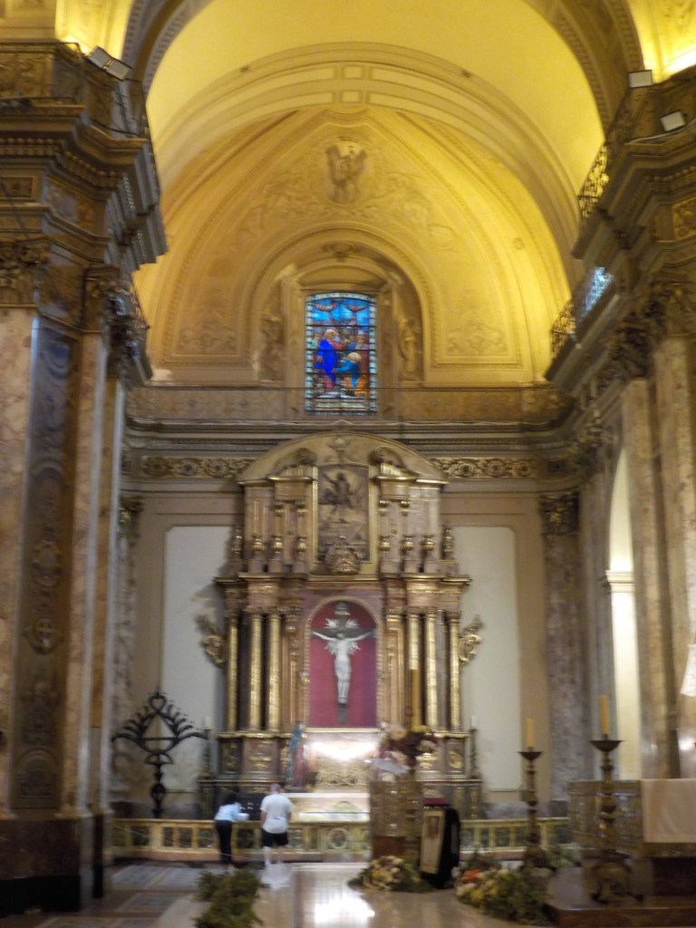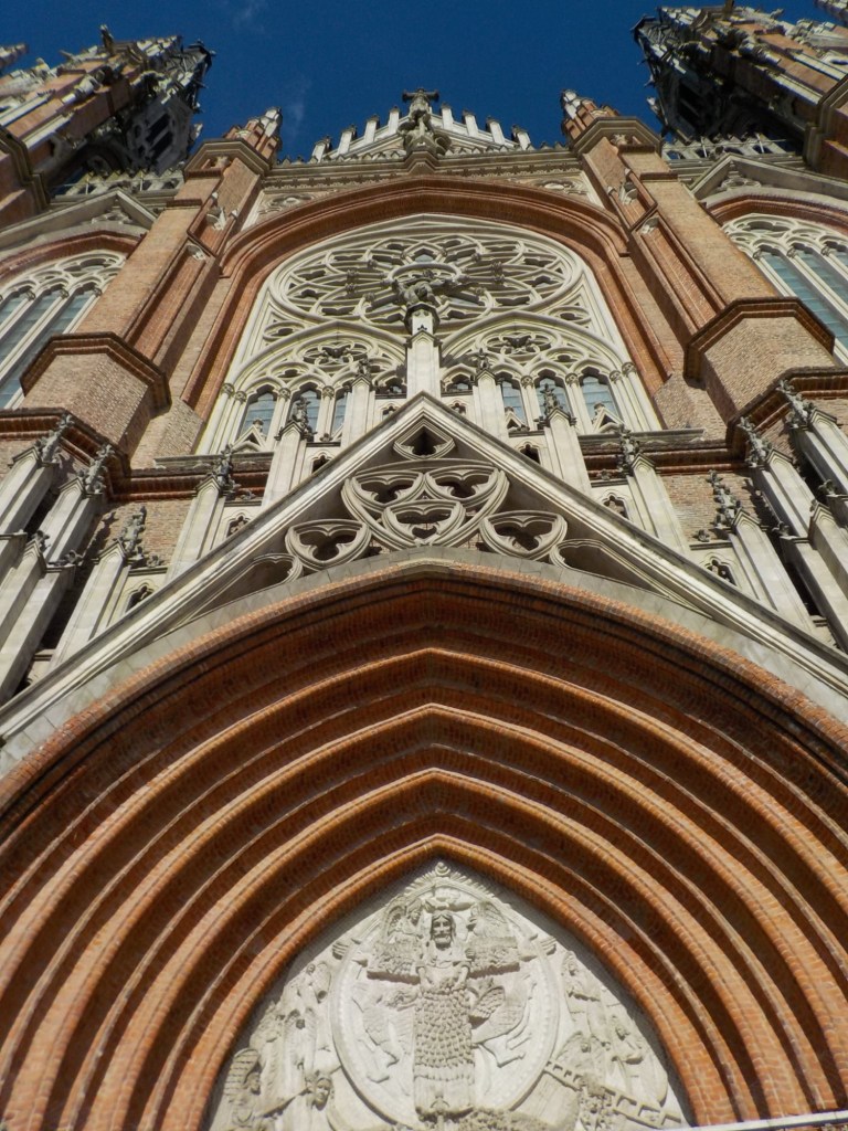 We had breakfast on the roof top terrace and the cathedral and plaza looked even more impressive in daylight. We went to the front desk to confirm that we could have a late checkout at noon but it was a different person at the desk and he said we had to be out by 11:00am – so we had 45 minutes to quickly dash across the road and go inside the cathedral which had been locked in the evening the day before to take some pictures as we had noted at breakfast that the gates were open. When we entered the church, Sunday mass was in progress and we stayed until after communion before returning to the hotel – we could not get any pictures during mass from the inside of the church except of one of the glass stained windows on our way out. We hurried back to the hotel and checked out and loaded our bikes and headed to the beach at Punta Lara.