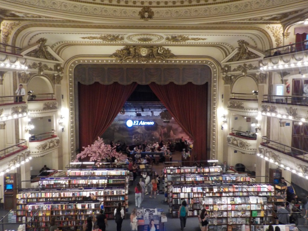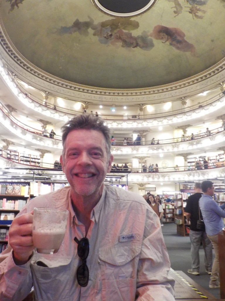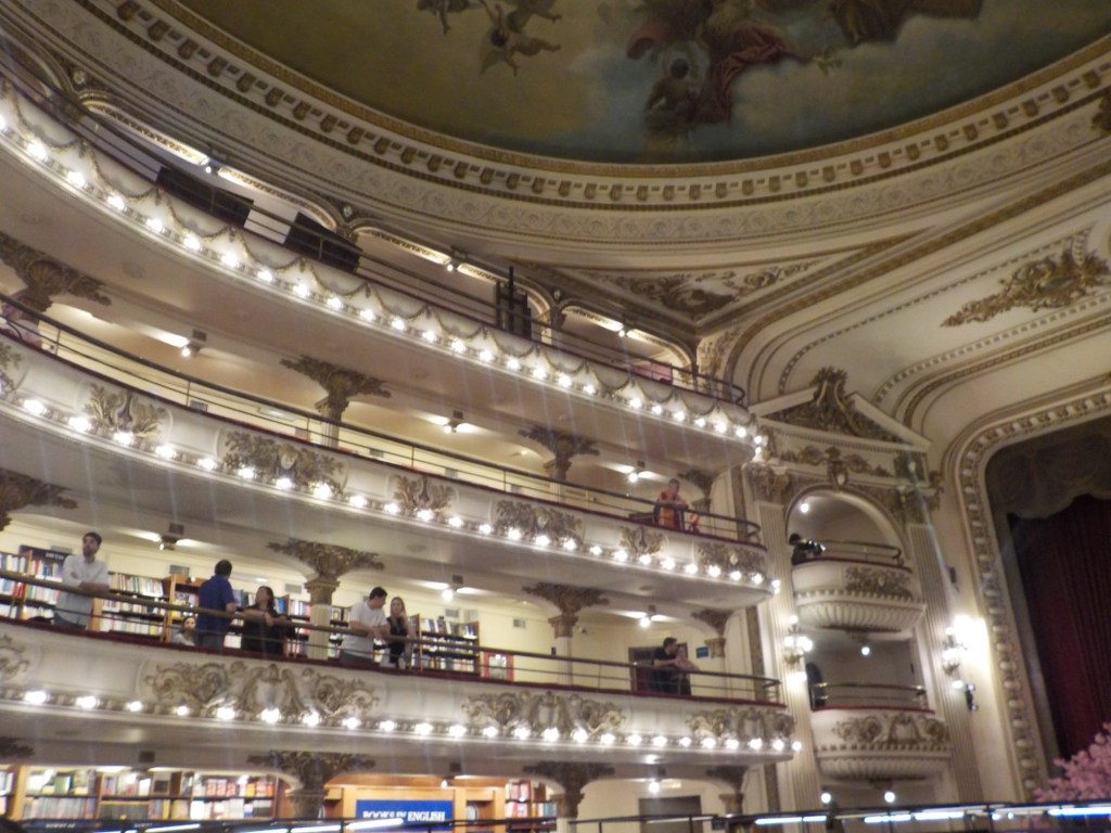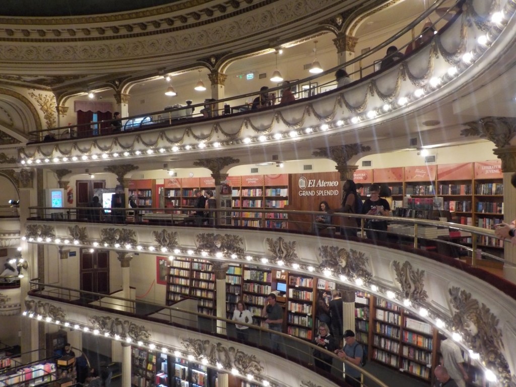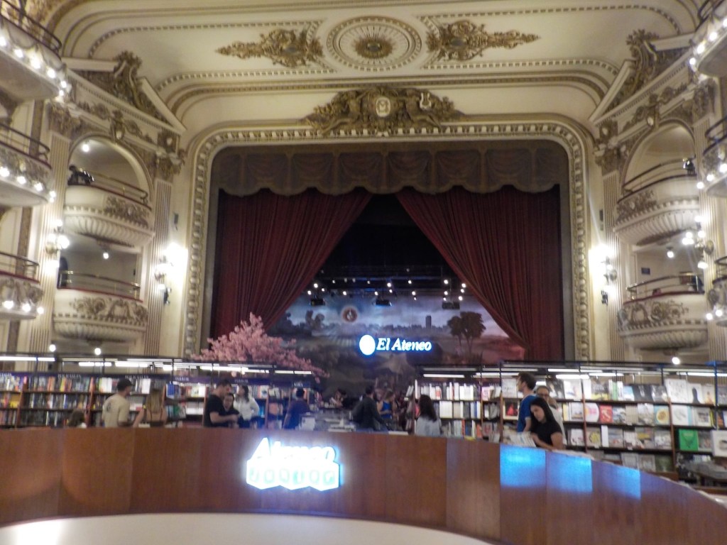 The next morning we had fabulous breakfast at the hotel and then we walked 2.4km through town and many nice parks to El Ateneo Grand Splendid which is an old theatre converted to a bookstore – it is magnificent inside and the stage is a coffee shop where we had very nice coffee and hot chocolate and lemon merengue cake. We bought some maps of South America and of Montevideo.