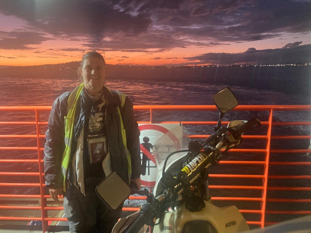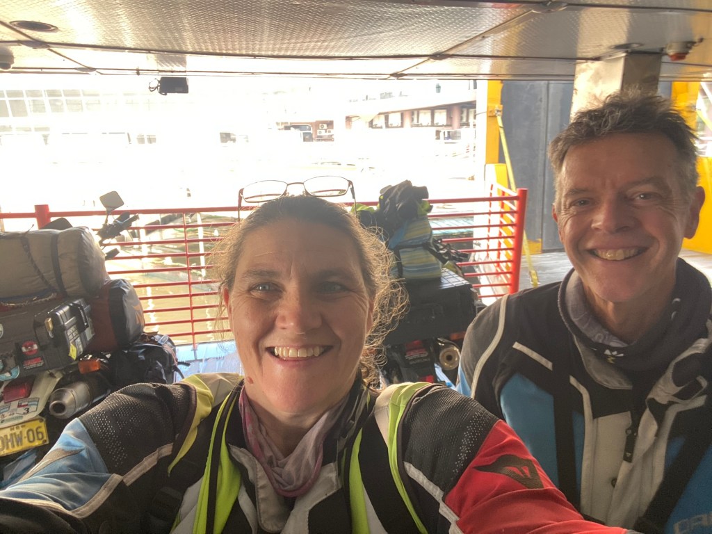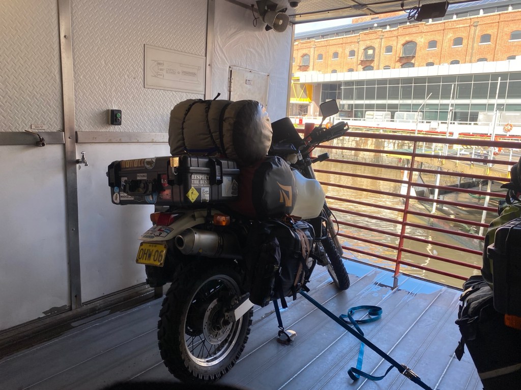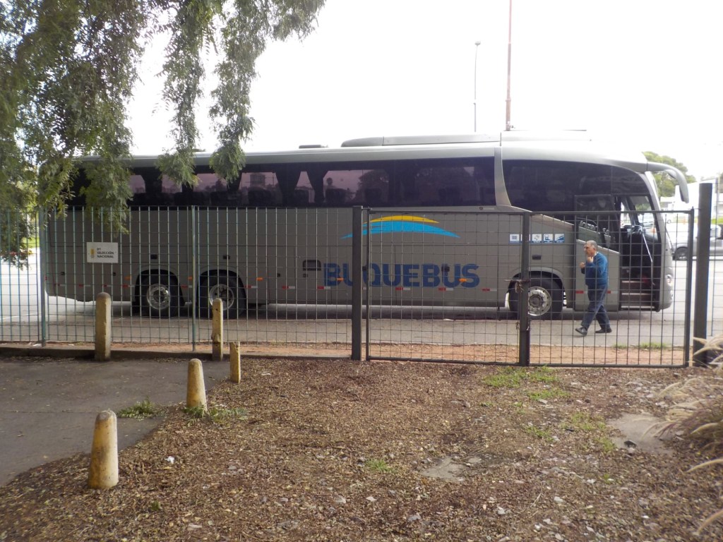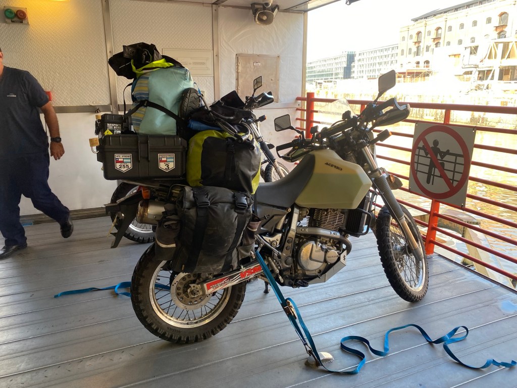 We left at 2:00 pm from the hotel up the very steep ramp out of the carpark to ride to the ferry terminal in the drizzling rain. When we arrived, we were pointed to where to park the bikes under cover by friendly staff. When I got off the bike, I realised that I had forgotten to put my backpack on and it was still sitting on the top box 🥹👍😂 We then had to go inside the terminal to check in and get our boarding passes printed. Then we had to go upstairs for immigration and we got finger printed and stamped into Uruguay. Next we had a croissant and a drink and then went back downstairs to our bikes where a group of guys were standing around and checking our bikes out 😉- it was both staff from the ferry as well as customs officials. They took our TIP off us and we were ready to ride onto the ferry, Francisco, which was built in Tasmania and is the fastest ferry in the world travelling at 100 km/hr powered by gas turbines 🙂. Staff directed us where to park right at the back of the boat and then tied our bikes down. We then walked up to the Tourist class section and chose seats at the back of the boat. There was a tour desk on board and we ended up booking a full day city tour of Montevideo for the next day.