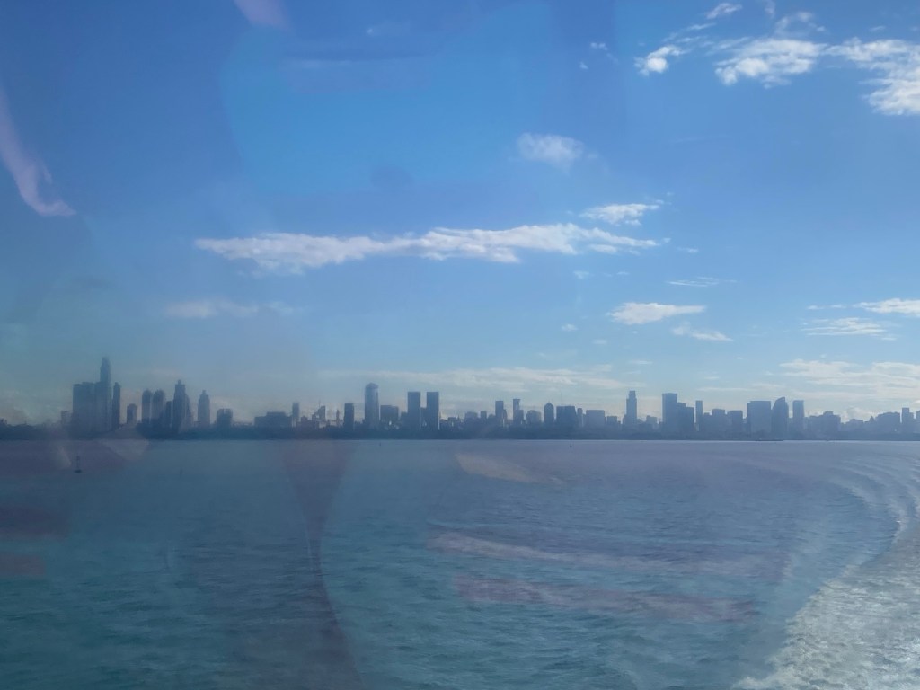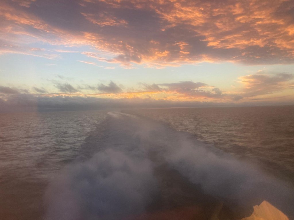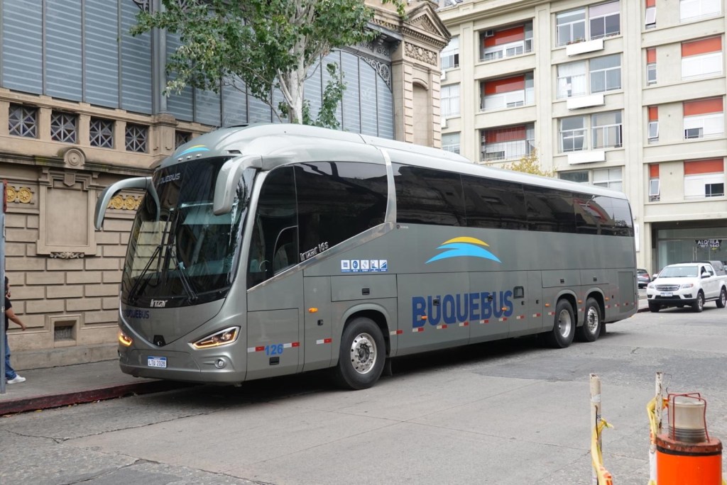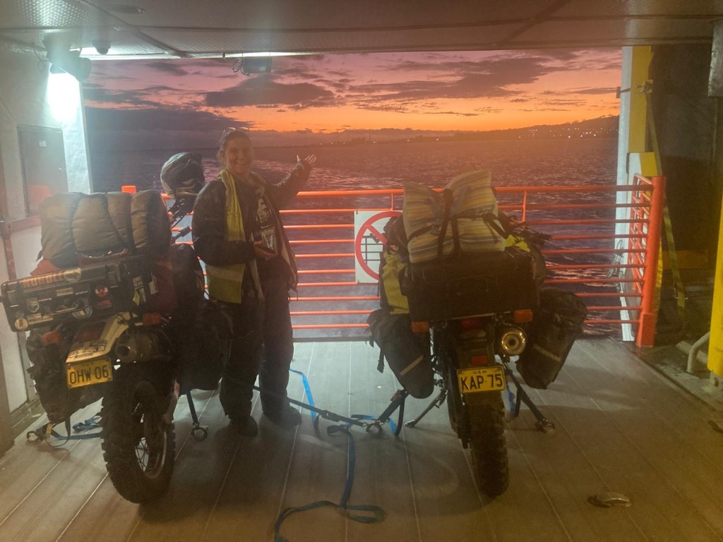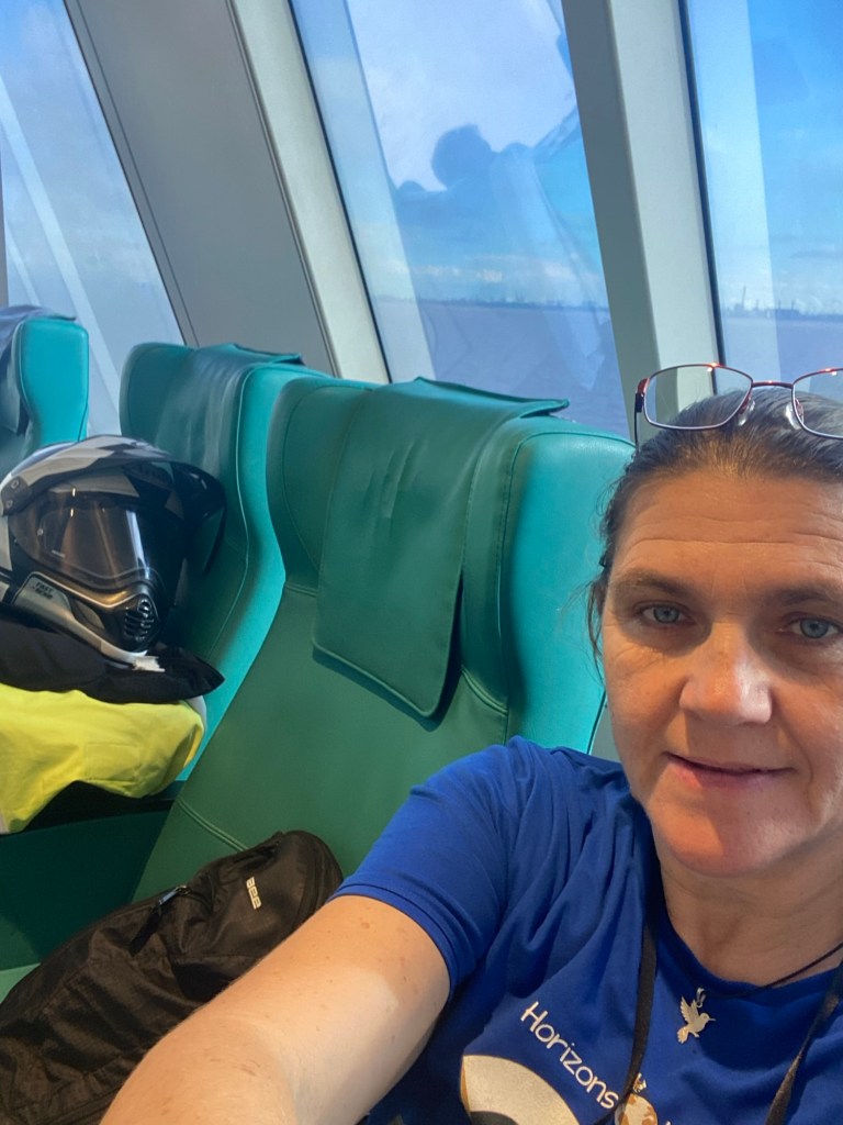 We left at 2:00 pm from the hotel up the very steep ramp out of the carpark to ride to the ferry terminal in the drizzling rain. When we arrived, we were pointed to where to park the bikes under cover by friendly staff. When I got off the bike, I realised that I had forgotten to put my backpack on and it was still sitting on the top box 🥹👍😂 We then had to go inside the terminal to check in and get our boarding passes printed. Then we had to go upstairs for immigration and we got finger printed and stamped into Uruguay. Next we had a croissant and a drink and then went back downstairs to our bikes where a group of guys were standing around and checking our bikes out 😉- it was both staff from the ferry as well as customs officials. They took our TIP off us and we were ready to ride onto the ferry, Francisco, which was built in Tasmania and is the fastest ferry in the world travelling at 100 km/hr powered by gas turbines 🙂. Staff directed us where to park right at the back of the boat and then tied our bikes down. We then walked up to the Tourist class section and chose seats at the back of the boat. There was a tour desk on board and we ended up booking a full day city tour of Montevideo for the next day.