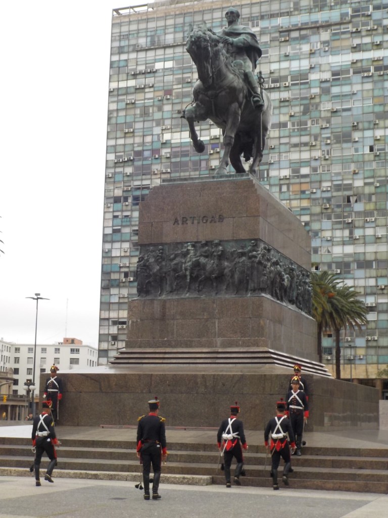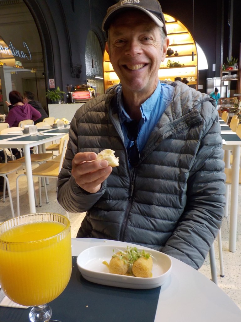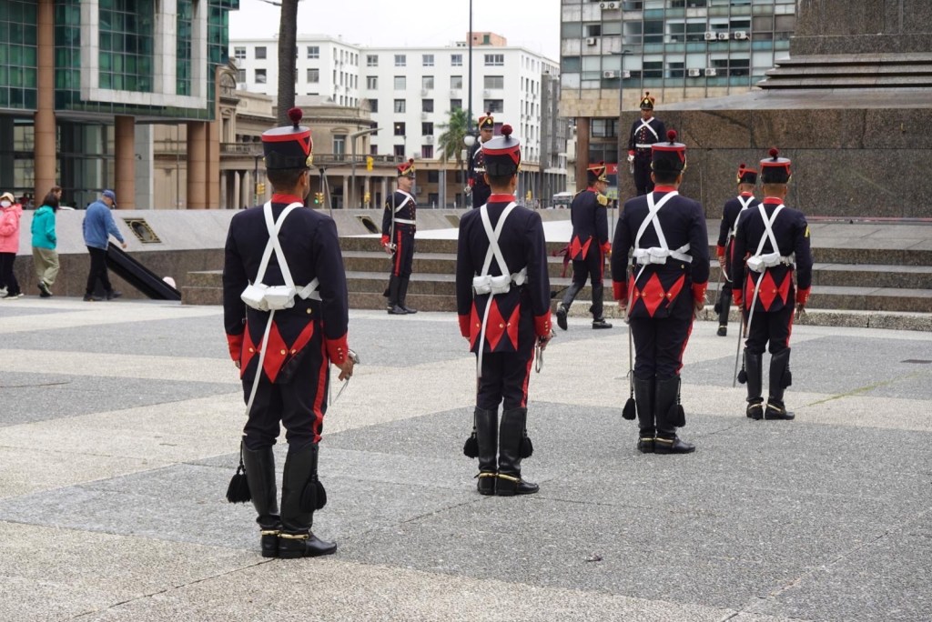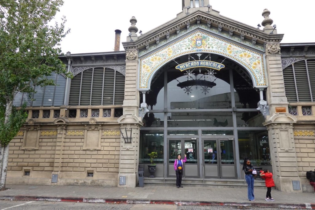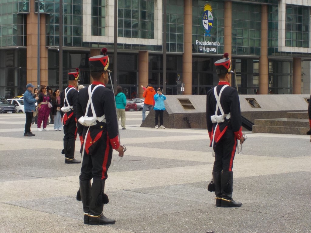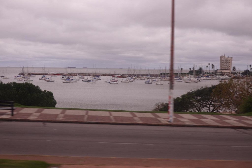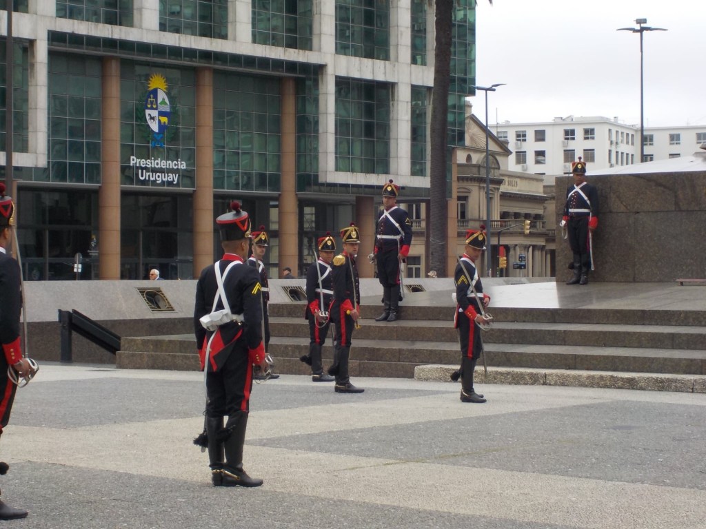 It was an overcast gray cloudy day and we walked to the ferry terminal where we were shown to our tour bus – a big Scania tourist coach with wifi on the bus – and our tour guide told us to scan a QR code and choose our 3 courses for lunch while waiting for the other 18 guests to arrive. They were a tour group from Serbia with their own tour guide who translated everything the guide said into Serbian – most of which I understood from my childhood days holidaying in former Yugoslavia – and then repeated it in better English than our Uruguayan tour guide. We took off and our first stop was the main plaza (Plaza Independencia) with the iconic building (Palacio Salvo) designed by the Italian immigrant Mario Palanti) which is the main landmark of Montevideo – it nowadays has offices and apartments and apparently the famous tango “La cumparsita” was first performed in a cafe on the corner in that building. On the Plaza Independencia is a statue of the Uruguayan hero, Josė Artigas, on horse and in front of it were the ceremonial guard was practising walking and taking stairs synchronised. The surrounding buildings on the plaza are a mix of modern glass fronts, older European style buildings with ornate facades and some very run down concrete high risers – very stark contrasts right at the main square and as we noticed everywhere else too. Our second stop was a market to go shopping – apparently most people come across from Argentina on the ferry to go shopping tax free and return on the same day. When we stopped, the building I saw looked like an abandoned place and I wondered whether that was the most worthwhile things to show off on a city tour 🤔 but the actual market place we were ushered into was on the opposite side of the street in a renovated market hall. We had quite some time to walk around and ended up buying another packet of cereal in a health store and coloured marker pens to start tracing our trip on a map. From there we returned back to the ferry terminal for lunch in the cafe del puerto canteen which turned out to be a very nice place and the food was delicious with 3 courses each with manageable portions and not too big.