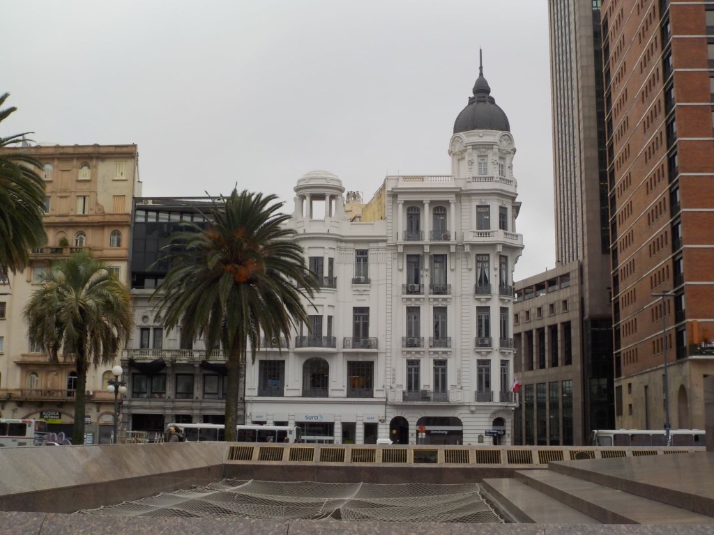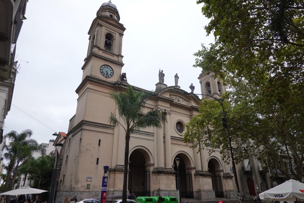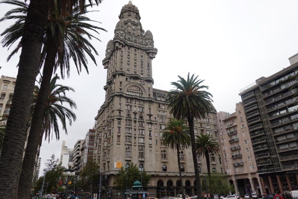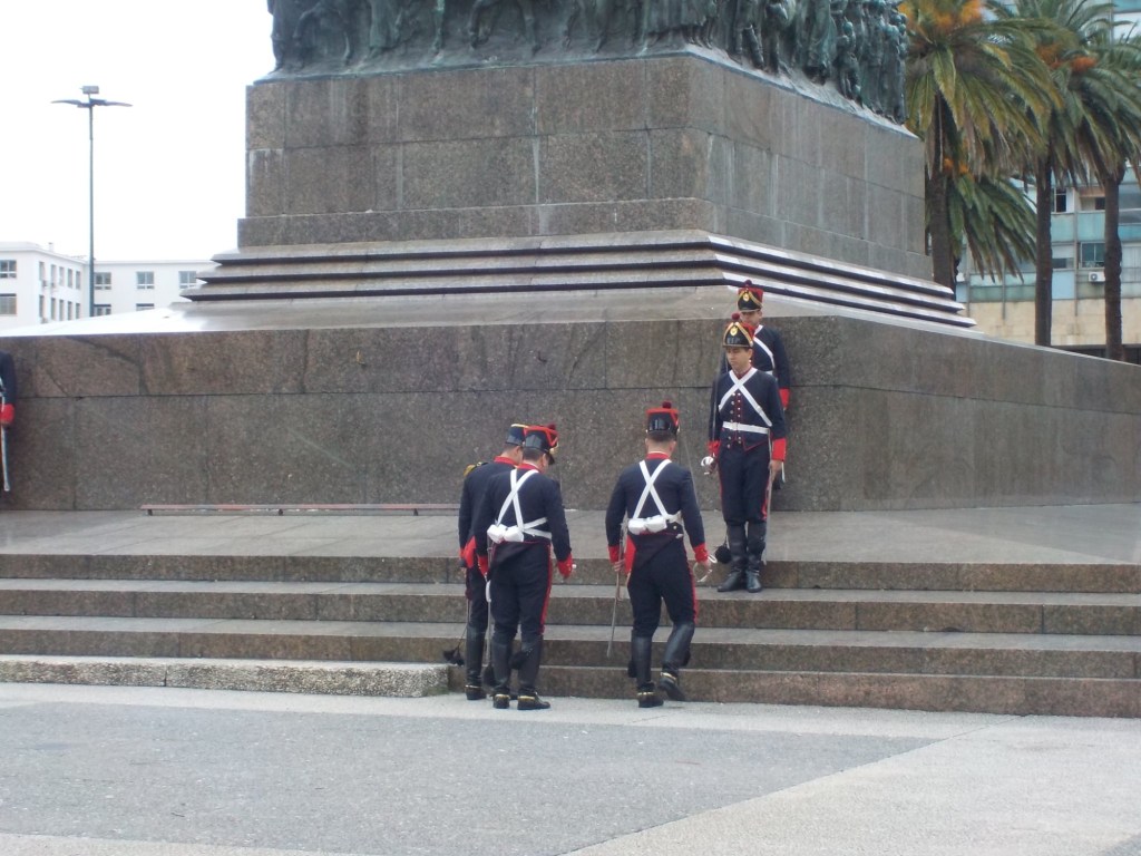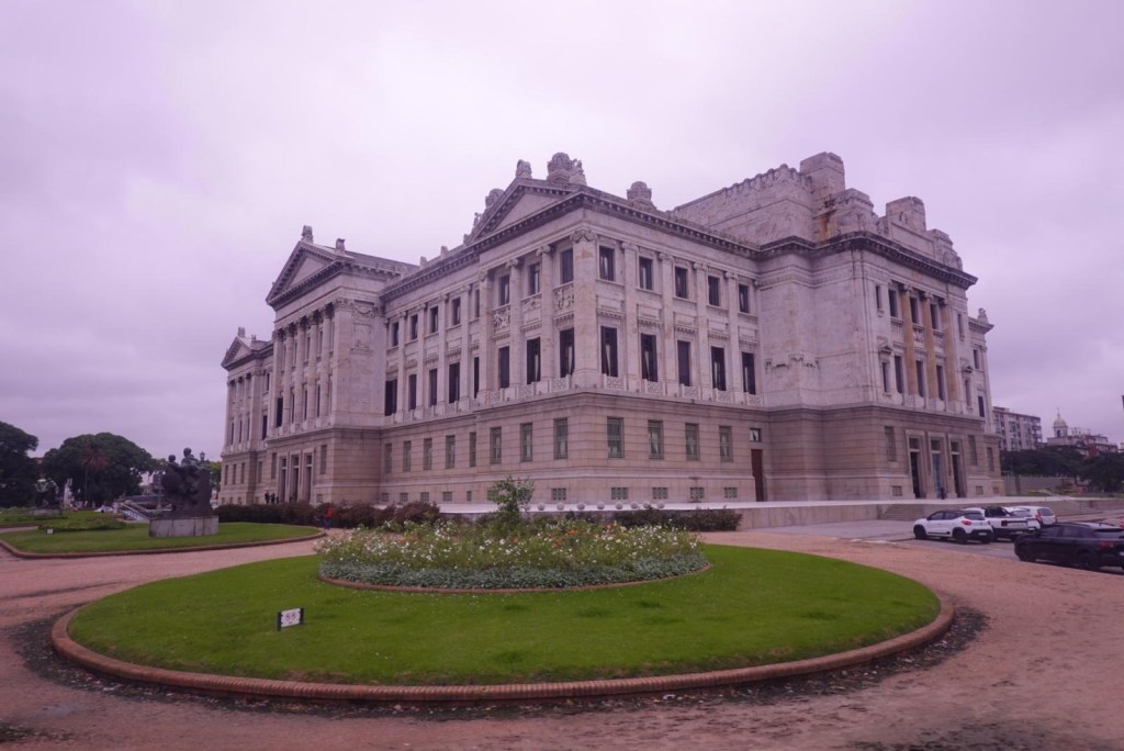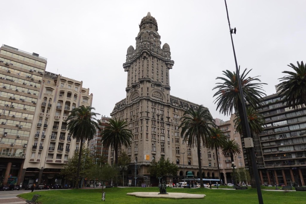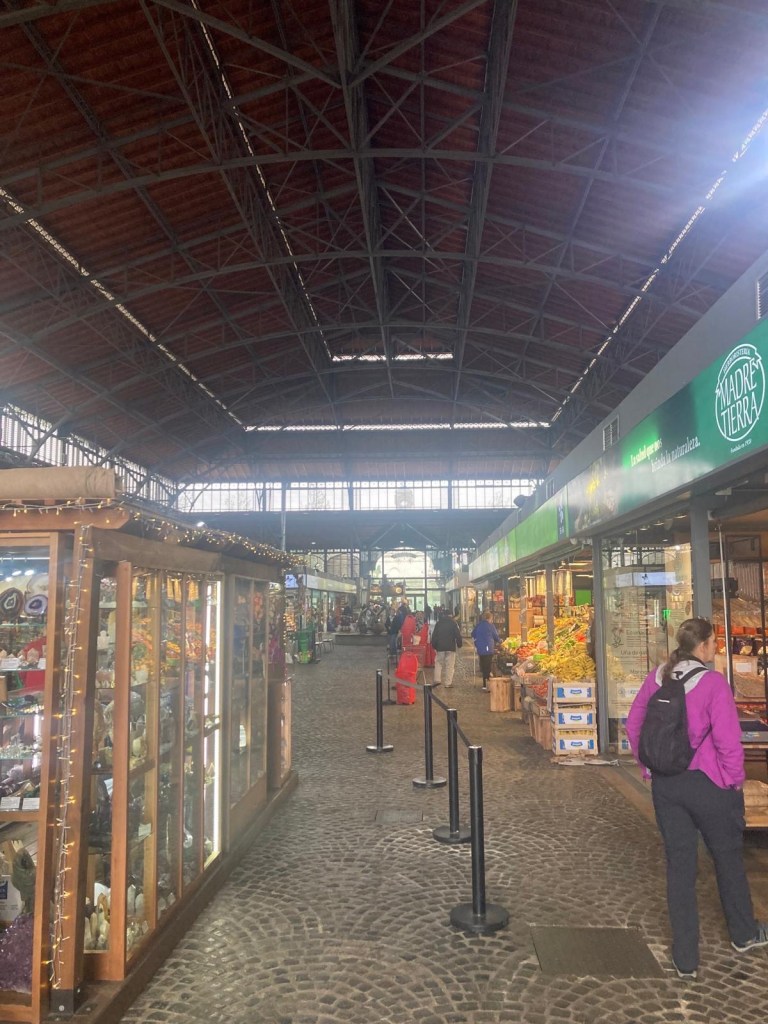 It was an overcast gray cloudy day and we walked to the ferry terminal where we were shown to our tour bus – a big Scania tourist coach with wifi on the bus – and our tour guide told us to scan a QR code and choose our 3 courses for lunch while waiting for the other 18 guests to arrive. They were a tour group from Serbia with their own tour guide who translated everything the guide said into Serbian – most of which I understood from my childhood days holidaying in former Yugoslavia – and then repeated it in better English than our Uruguayan tour guide. We took off and our first stop was the main plaza (Plaza Independencia) with the iconic building (Palacio Salvo) designed by the Italian immigrant Mario Palanti) which is the main landmark of Montevideo – it nowadays has offices and apartments and apparently the famous tango “La cumparsita” was first performed in a cafe on the corner in that building. On the Plaza Independencia is a statue of the Uruguayan hero, Josė Artigas, on horse and in front of it were the ceremonial guard was practising walking and taking stairs synchronised. The surrounding buildings on the plaza are a mix of modern glass fronts, older European style buildings with ornate facades and some very run down concrete high risers – very stark contrasts right at the main square and as we noticed everywhere else too. Our second stop was a market to go shopping – apparently most people come across from Argentina on the ferry to go shopping tax free and return on the same day. When we stopped, the building I saw looked like an abandoned place and I wondered whether that was the most worthwhile things to show off on a city tour 🤔 but the actual market place we were ushered into was on the opposite side of the street in a renovated market hall. We had quite some time to walk around and ended up buying another packet of cereal in a health store and coloured marker pens to start tracing our trip on a map. From there we returned back to the ferry terminal for lunch in the cafe del puerto canteen which turned out to be a very nice place and the food was delicious with 3 courses each with manageable portions and not too big.