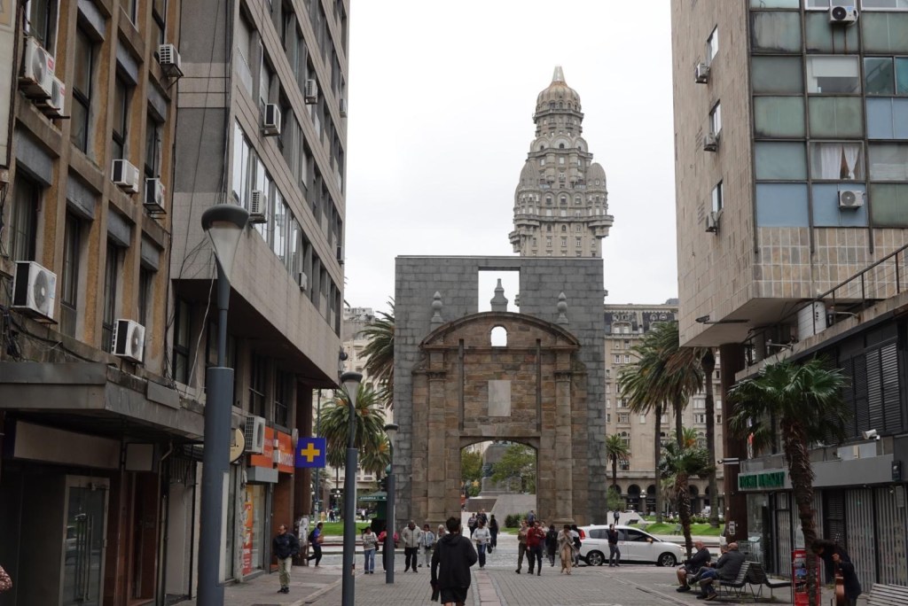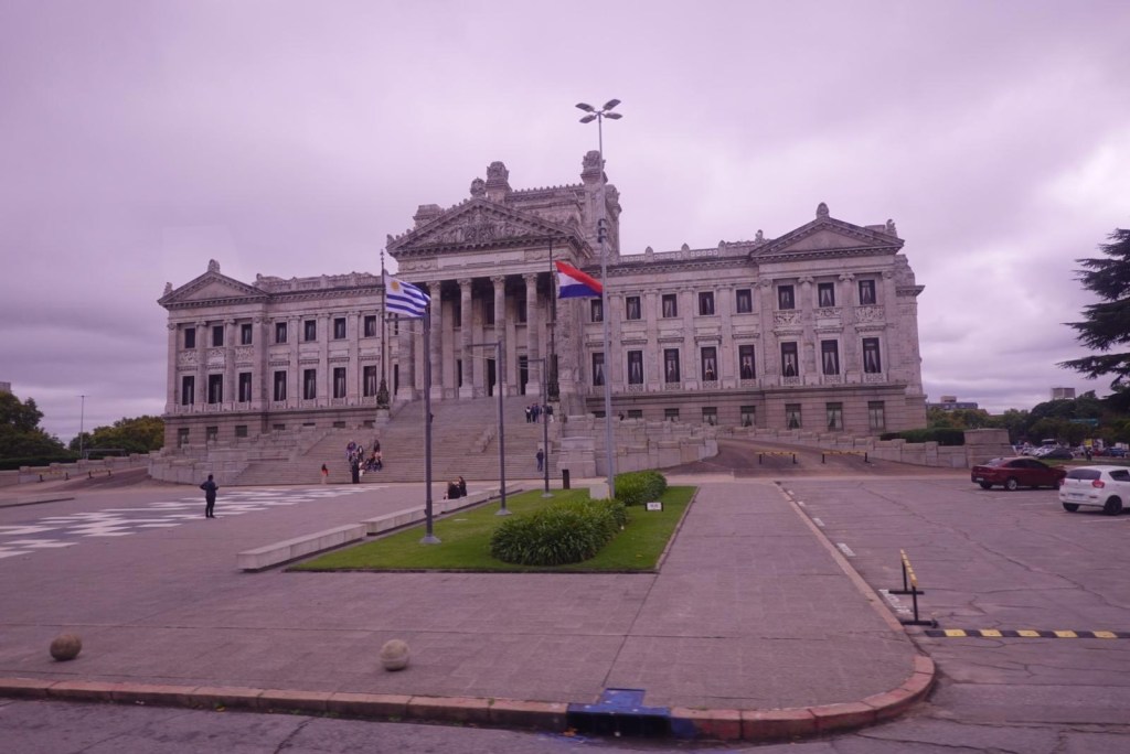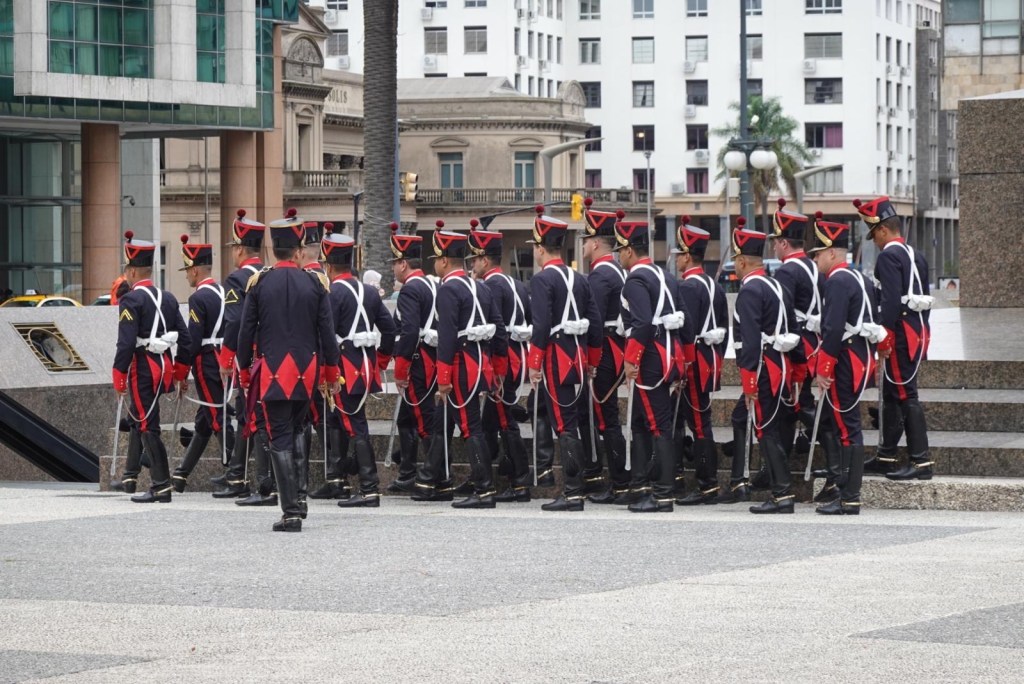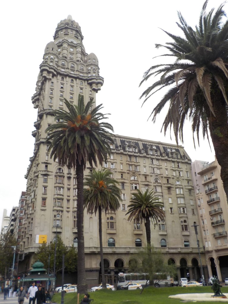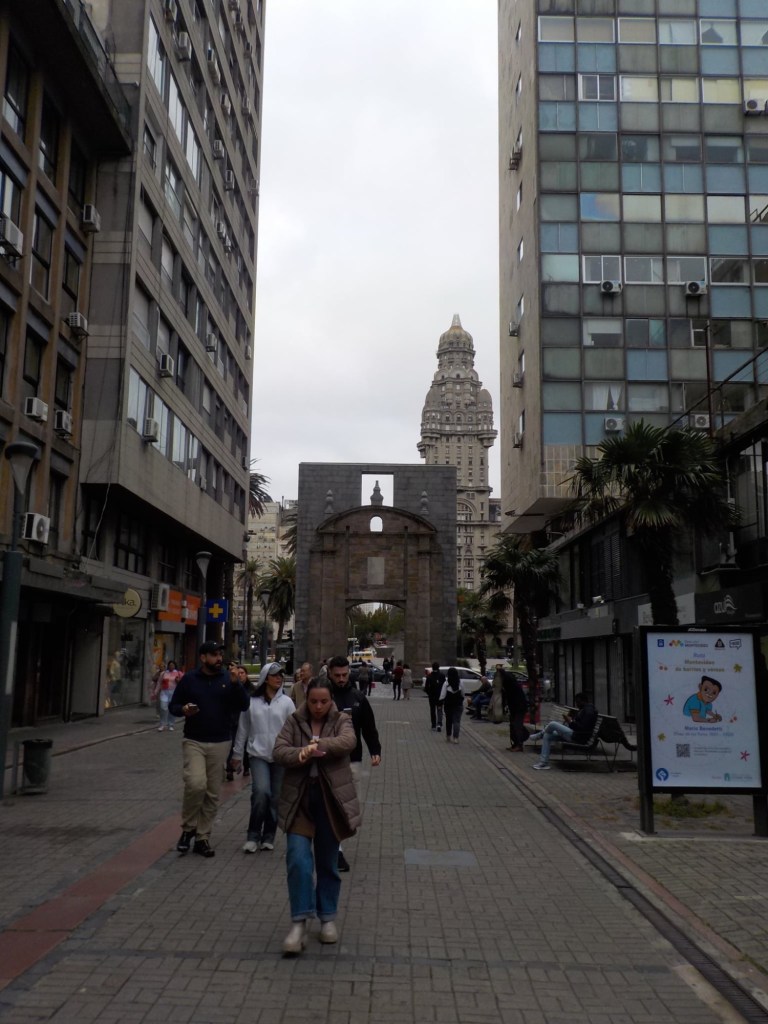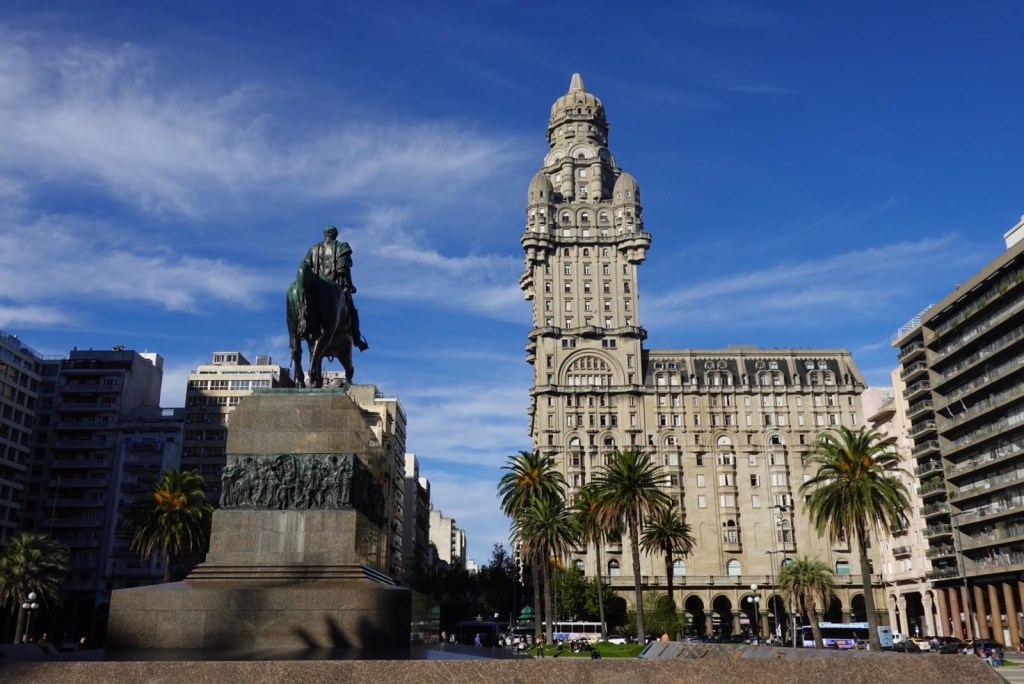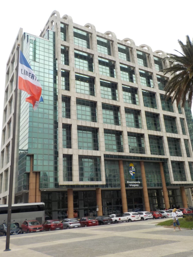 It was an overcast gray cloudy day and we walked to the ferry terminal where we were shown to our tour bus – a big Scania tourist coach with wifi on the bus – and our tour guide told us to scan a QR code and choose our 3 courses for lunch while waiting for the other 18 guests to arrive. They were a tour group from Serbia with their own tour guide who translated everything the guide said into Serbian – most of which I understood from my childhood days holidaying in former Yugoslavia – and then repeated it in better English than our Uruguayan tour guide. We took off and our first stop was the main plaza (Plaza Independencia) with the iconic building (Palacio Salvo) designed by the Italian immigrant Mario Palanti) which is the main landmark of Montevideo – it nowadays has offices and apartments and apparently the famous tango “La cumparsita” was first performed in a cafe on the corner in that building. On the Plaza Independencia is a statue of the Uruguayan hero, Josė Artigas, on horse and in front of it were the ceremonial guard was practising walking and taking stairs synchronised. The surrounding buildings on the plaza are a mix of modern glass fronts, older European style buildings with ornate facades and some very run down concrete high risers – very stark contrasts right at the main square and as we noticed everywhere else too. Our second stop was a market to go shopping – apparently most people come across from Argentina on the ferry to go shopping tax free and return on the same day. When we stopped, the building I saw looked like an abandoned place and I wondered whether that was the most worthwhile things to show off on a city tour 🤔 but the actual market place we were ushered into was on the opposite side of the street in a renovated market hall. We had quite some time to walk around and ended up buying another packet of cereal in a health store and coloured marker pens to start tracing our trip on a map. From there we returned back to the ferry terminal for lunch in the cafe del puerto canteen which turned out to be a very nice place and the food was delicious with 3 courses each with manageable portions and not too big.