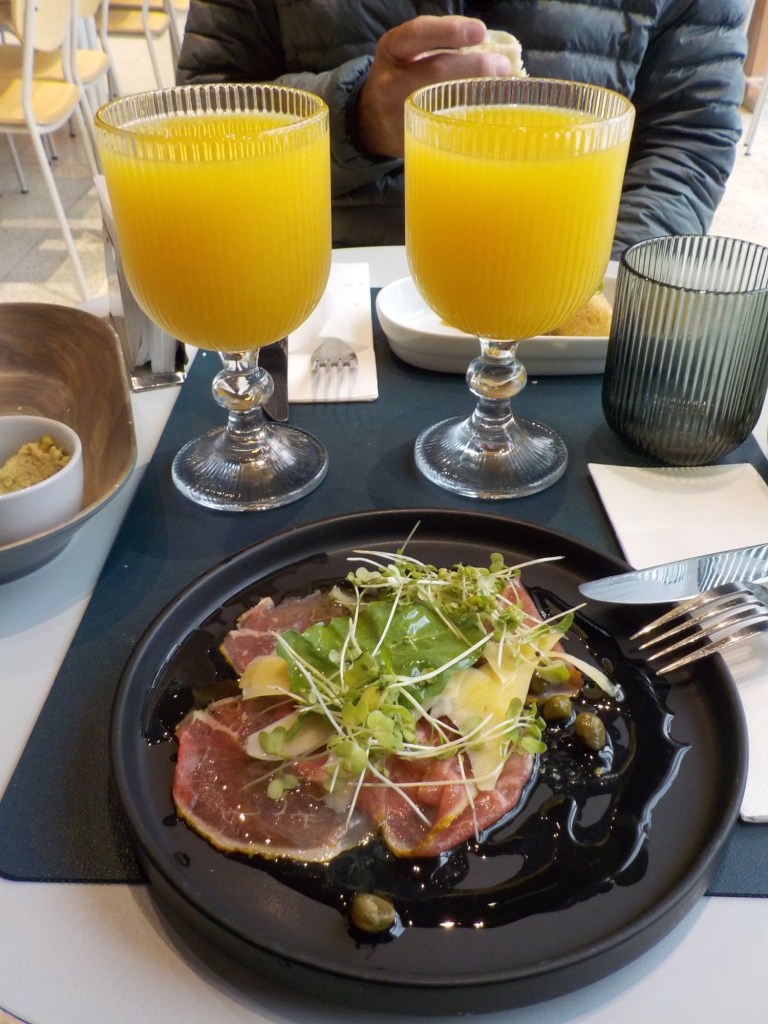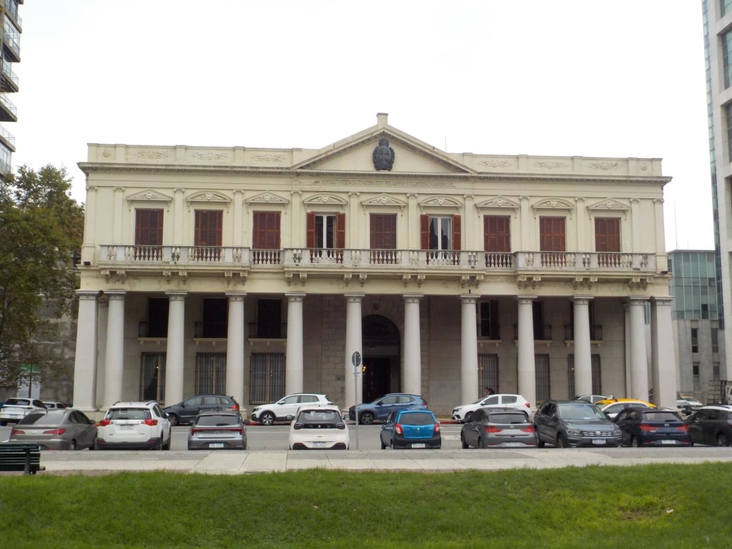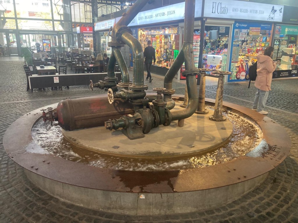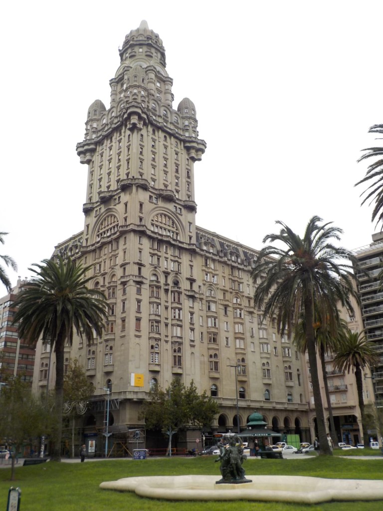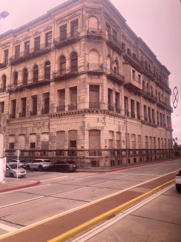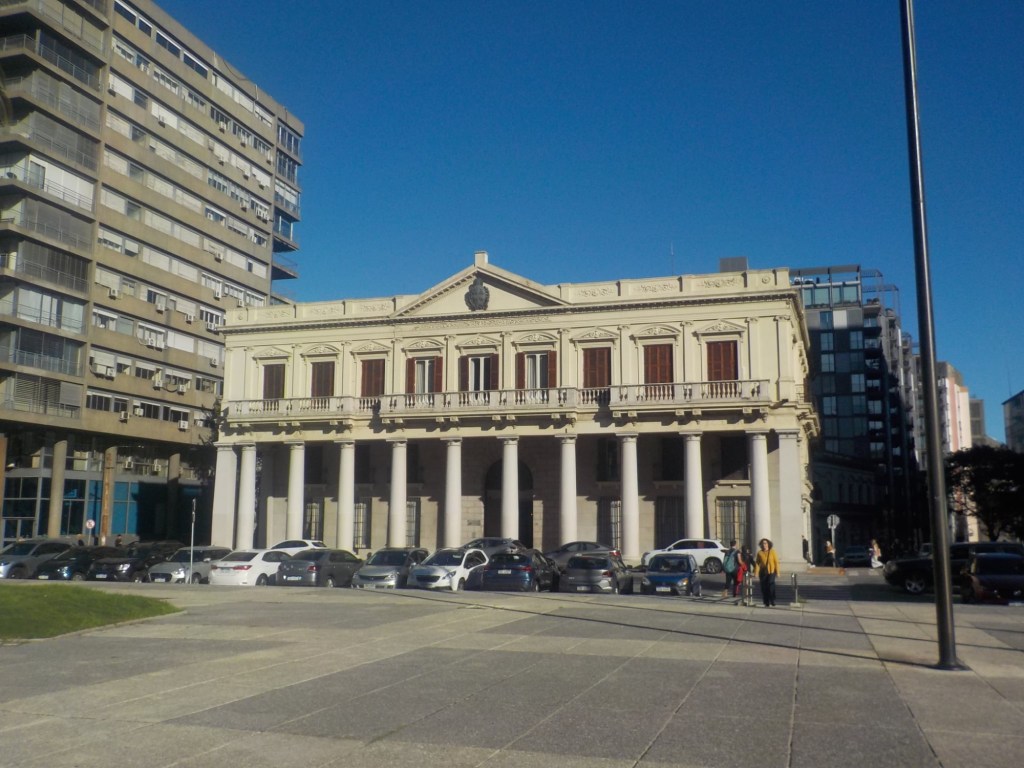 It was an overcast gray cloudy day and we walked to the ferry terminal where we were shown to our tour bus – a big Scania tourist coach with wifi on the bus – and our tour guide told us to scan a QR code and choose our 3 courses for lunch while waiting for the other 18 guests to arrive. They were a tour group from Serbia with their own tour guide who translated everything the guide said into Serbian – most of which I understood from my childhood days holidaying in former Yugoslavia – and then repeated it in better English than our Uruguayan tour guide. We took off and our first stop was the main plaza (Plaza Independencia) with the iconic building (Palacio Salvo) designed by the Italian immigrant Mario Palanti) which is the main landmark of Montevideo – it nowadays has offices and apartments and apparently the famous tango “La cumparsita” was first performed in a cafe on the corner in that building. On the Plaza Independencia is a statue of the Uruguayan hero, Josė Artigas, on horse and in front of it were the ceremonial guard was practising walking and taking stairs synchronised. The surrounding buildings on the plaza are a mix of modern glass fronts, older European style buildings with ornate facades and some very run down concrete high risers – very stark contrasts right at the main square and as we noticed everywhere else too. Our second stop was a market to go shopping – apparently most people come across from Argentina on the ferry to go shopping tax free and return on the same day. When we stopped, the building I saw looked like an abandoned place and I wondered whether that was the most worthwhile things to show off on a city tour 🤔 but the actual market place we were ushered into was on the opposite side of the street in a renovated market hall. We had quite some time to walk around and ended up buying another packet of cereal in a health store and coloured marker pens to start tracing our trip on a map. From there we returned back to the ferry terminal for lunch in the cafe del puerto canteen which turned out to be a very nice place and the food was delicious with 3 courses each with manageable portions and not too big.
