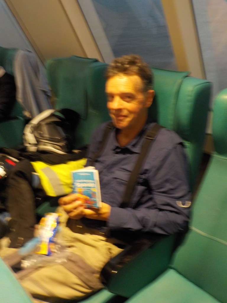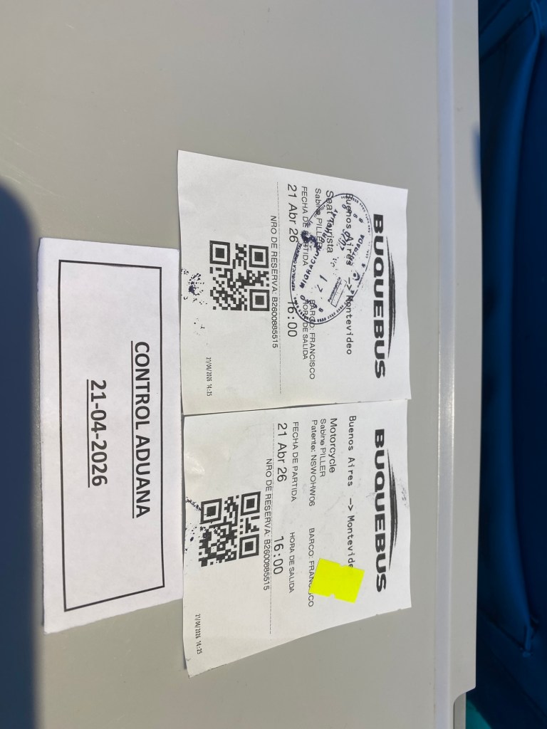 Andrew had a little snooze and I did some Sudoku and we arrived on time at 18:45 in Montevideo just after the sun had set and it was not raining but the roads were very wet – we embarked before all the cars and were directed through roads until we were stopped and asked to park our bikes on the side of the road and walk back 300m to a glass building to go through customs to import our bikes. We took all our paperwork with us and left the bikes parked where they had told us to. When we arrived at the customs building, a female customs officer asked us to follow her to a container where she started to process Andrew’s bike first. A second female officer who spoke English came and processed my bike and took photocopies of all my insurance papers (the ones we had gotten printed out just the night before in the hotel) and then printed and signed our new TIP. We were then allowed to go back to the bikes and leave the port terminal without any further checks.